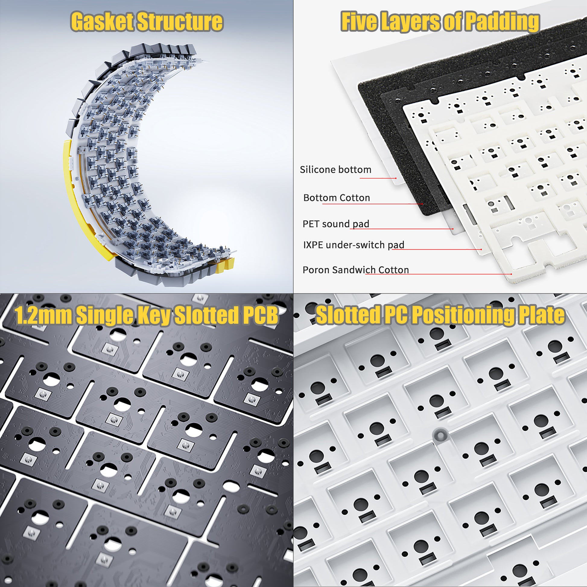 【Gasket Structure】AK820 mechanical keyboard uses a gasket-mounted design coupled with a Flex-cut PC plate, built-in 5 layers of sound insulation cotton, Poron sandwich cotton, IXPE under-axis pad, PET premium sound pad and bottom cotton, Noise is maximally reduced, The 1.2 mm PCB board slot and the PC positioning board slot optimize resilience and stability,making the hand feel softer and more elastic.